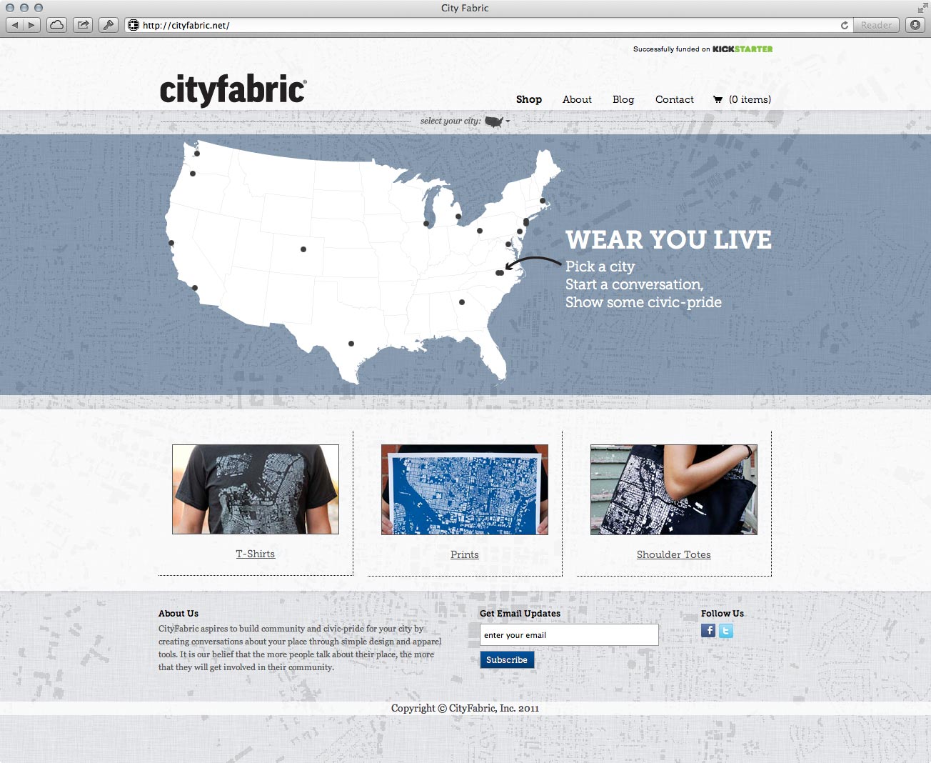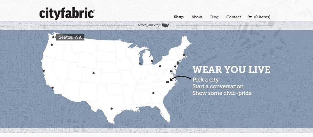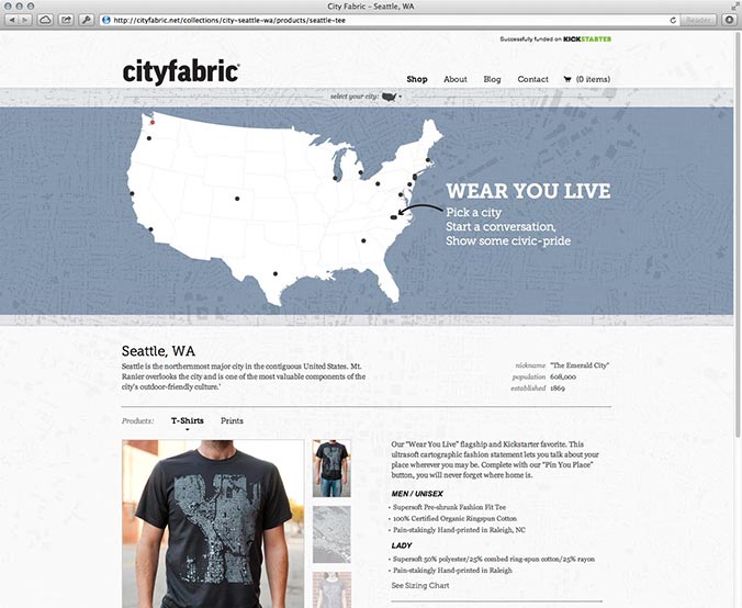 The website allows users to learn more about City Fabric and to browse and purchase their goods. Users can browse by city using an interactive map or browse by product. Individual product pages give details and interesting facts about the mapped city.