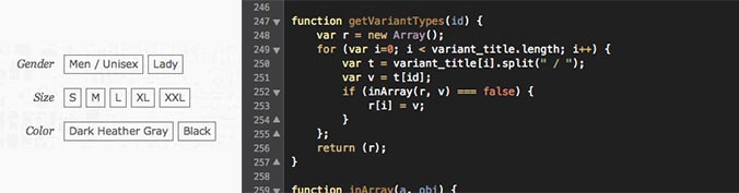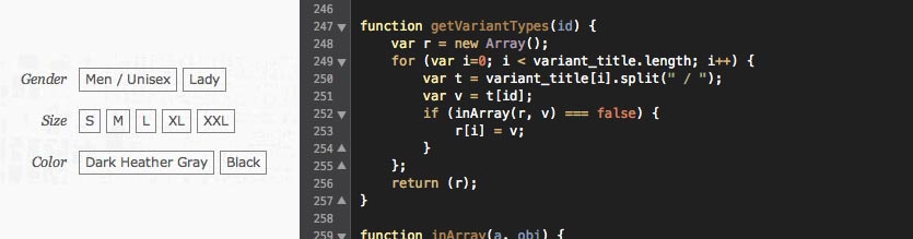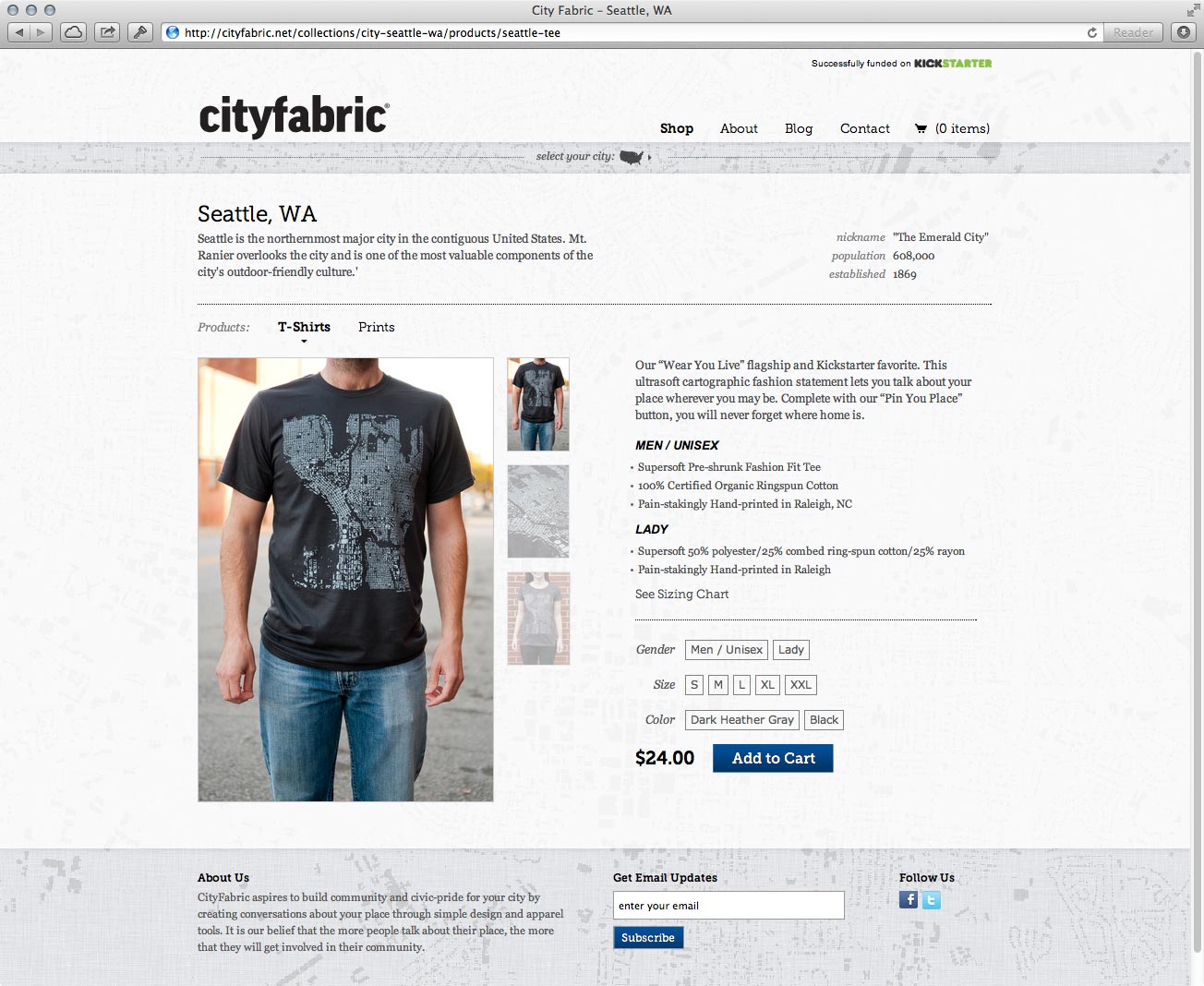 Some of the products have multiple options that the user must choose from. The City Fabric site used Shopify as a backend. By default, Shopify handles options by displaying a single dropdown with each option combination as an entry. For t-shirts, that meant there would be twenty items in the dropdown. I wrote some javascript that parsed the dropdown and split the results into an easier-to-use control.