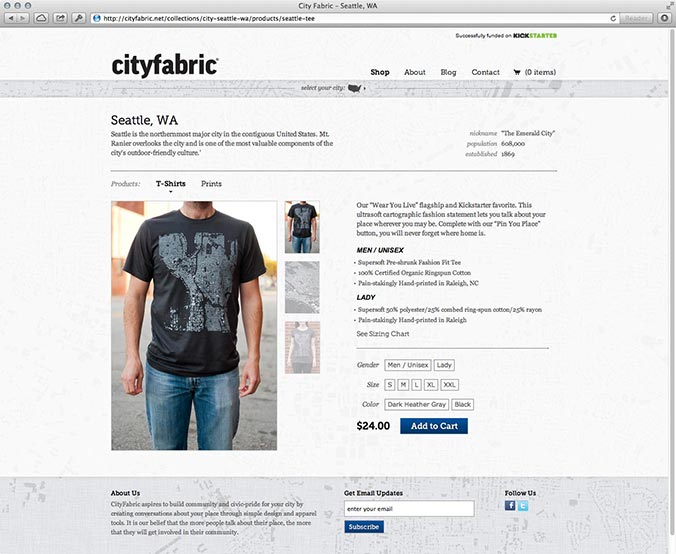 I designed and developed the website for City Fabric, a local business based out of Raleigh, NC. City Fabric produces t-shirts and other items printed with a special type of figure ground map typically used by landscape architects. The maps show urban density and are intended to start conversation.
