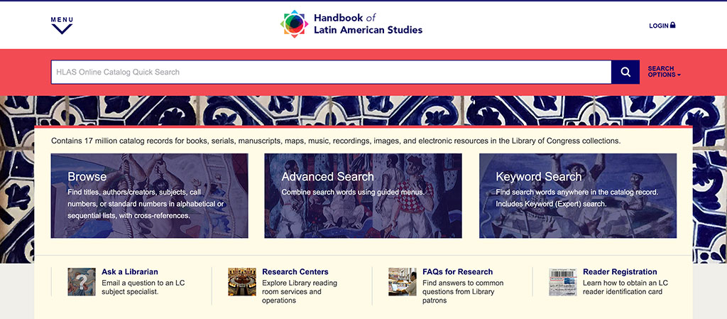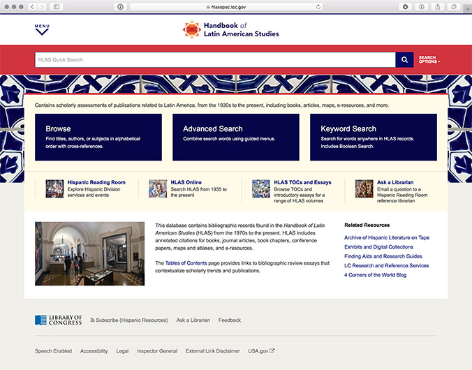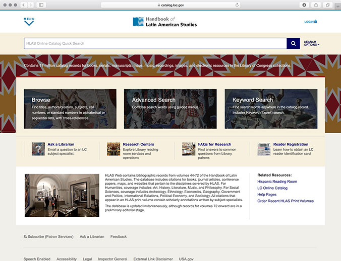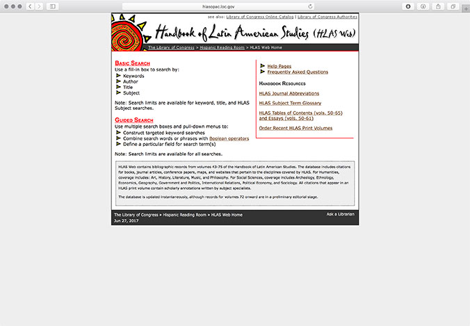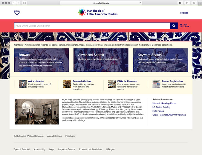 In an effort to modernize the Hispanic of Latin Studies website the Library of Congress decided to migrate its contents into the framework used for other Library Catalogs. This migration has many benefits. The modern catalog framework is responsive, accessible, and provides powerful search features that will allow users to more easily find HLAS content. Users who were already familiar with the search capabilities in the normal library Catalog would immediately be able to perform advanced searches in the HLAS catalog.