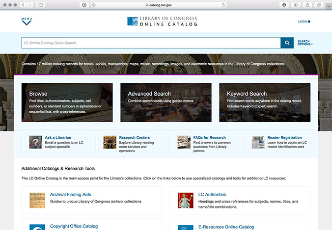 The Library of Congress Catalog site uses a modern responsive design and many library patrons and researchers are familiar with how to use its advanced search capabilites.