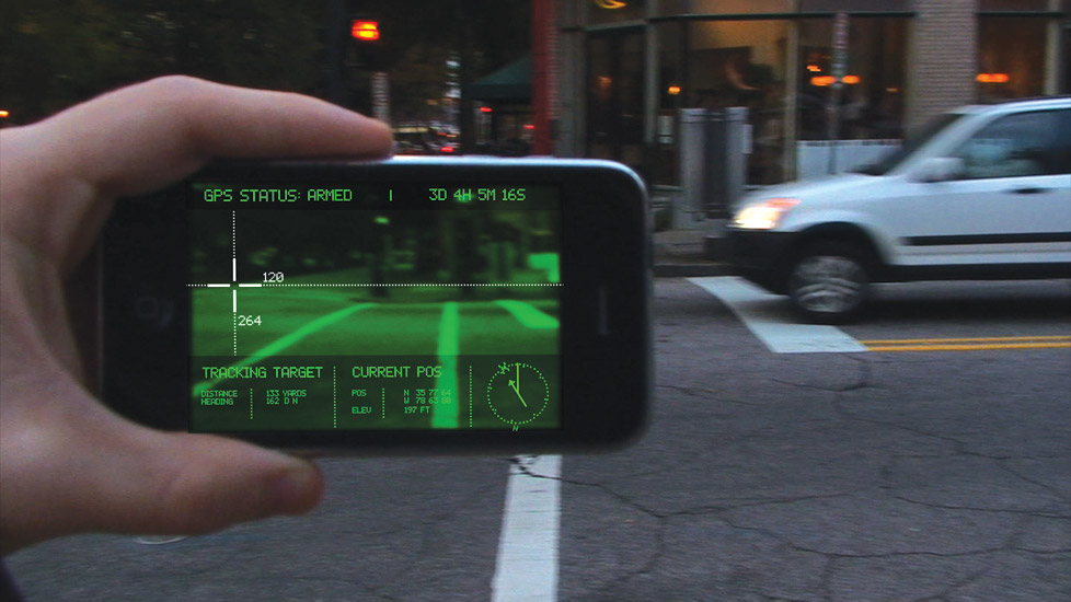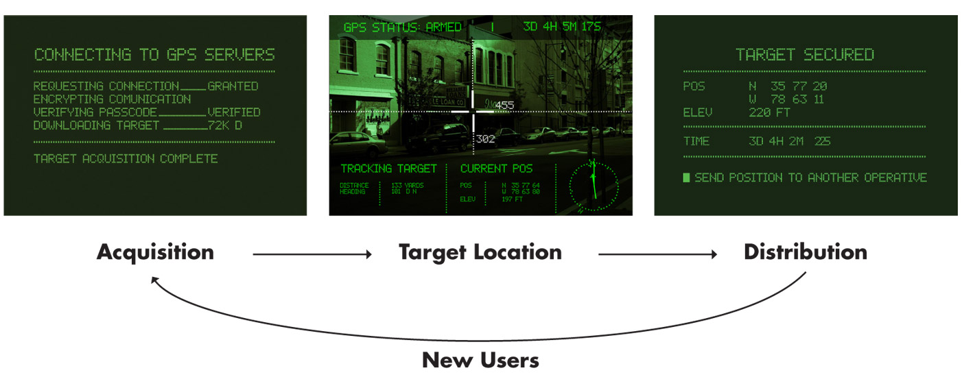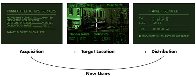 Usage scenario for Wayfinding Application. With this iPhone application, Guerrilla Projectionist Society viewers become “mission operatives,” downloading “targets” (the location of the next Guerrilla Projectionist Society projection), navigating to them with the aid of augmented reality, and finally, spreading the application to friends, and, in the process, virally marketing the Guerrilla Projectionist Society.