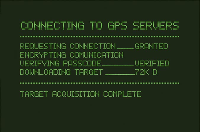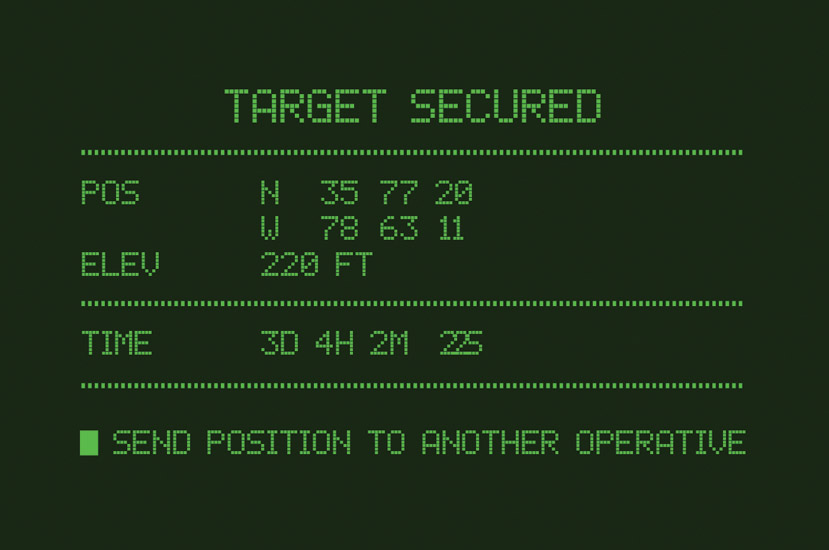 This application uses the built-in GPS and compass to determine the position of the next event. While the GPS obtains the current location in the background, the application visibly "downloads" the next mission, adding to the pseudo-military feel.