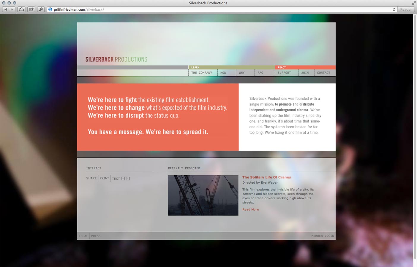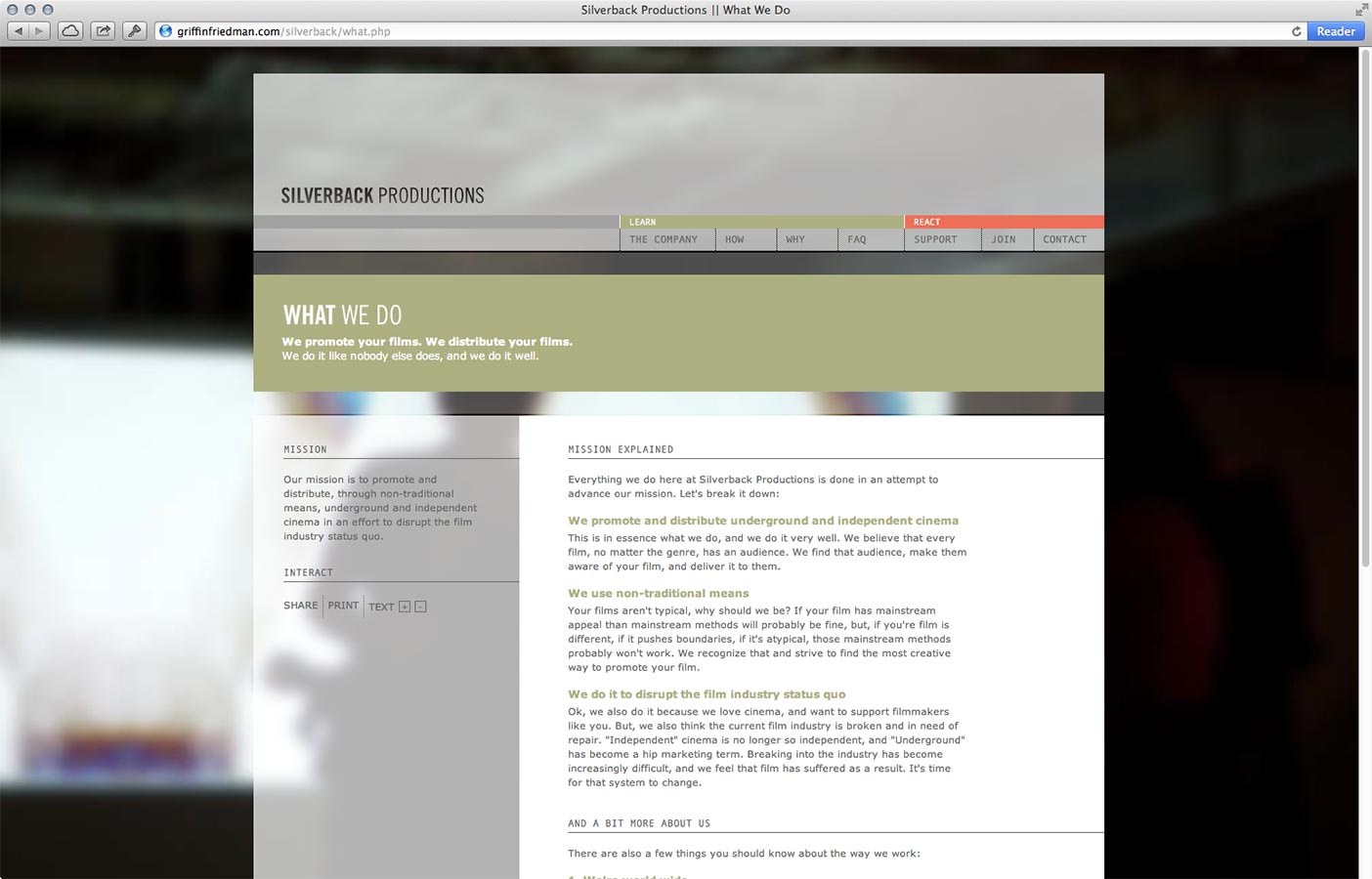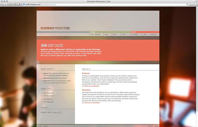 The Silverback Productions homepage. Content is divided into two sections: "Learn" and "React." Visitors progress through the pages with the eventual goal of joining the organization.