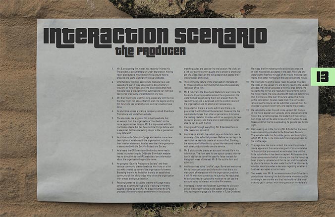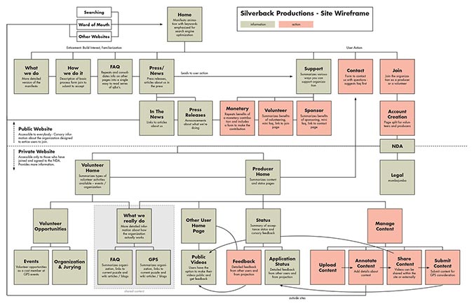 Silverback Productions was a semester long group project in which we developed an organization to promote and distribute underground and independent cinema. I worked with William Calloway and Kelley McClure on the project. My role in the group was as the interaction designer.